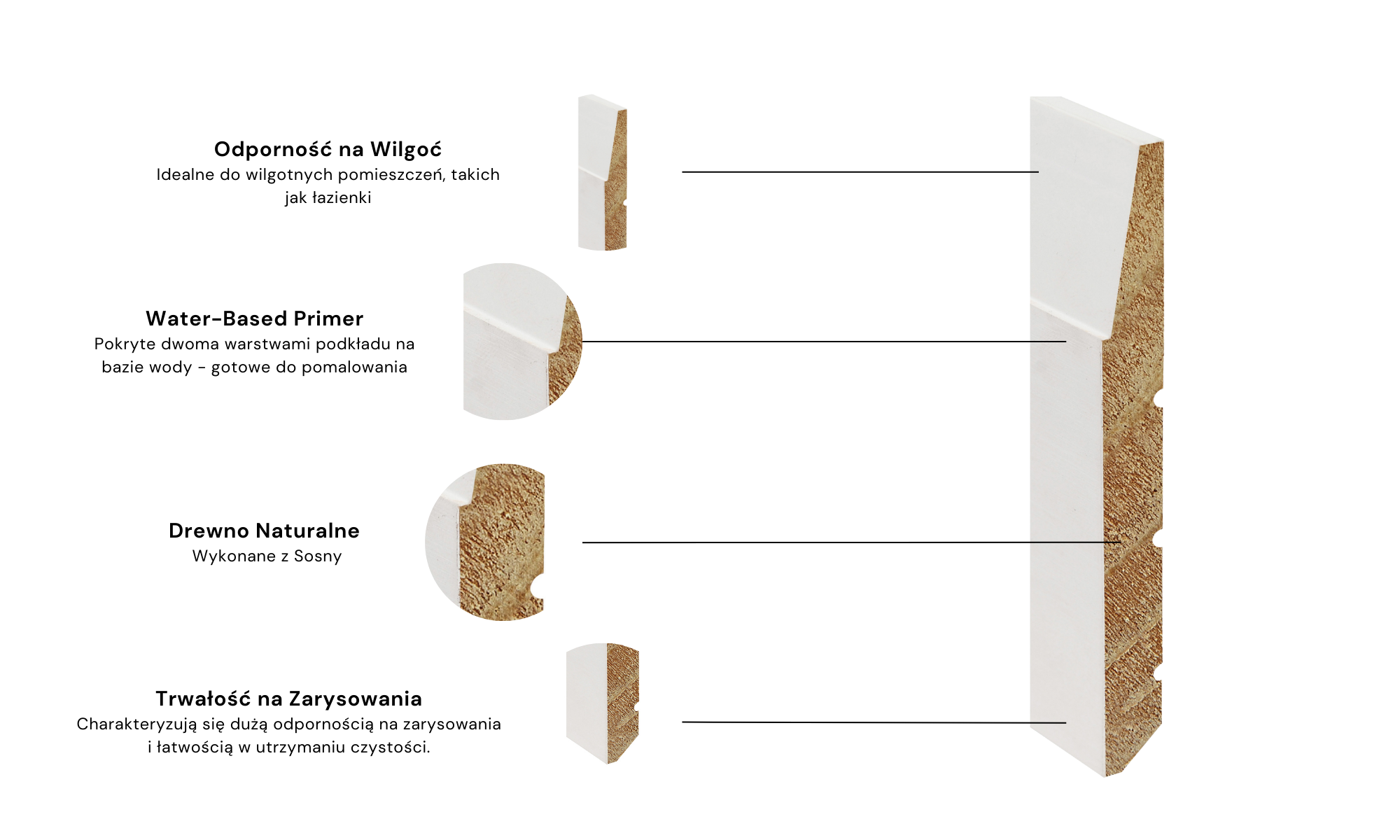 Listwa Sosnowa [80mm x 16mm x 2743mm] Pokryte dwuwarstwowym podkładem GESSO RAL 9003